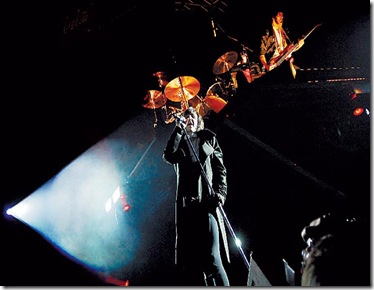 El concierto comenzó con Estoy rabioso, de Mucho, para devenir en catarata rocker con Sin mi diablo y Pendejo. El impacto como primera impresión con el impulso de una puesta agresiva. La escenografía suele relegarse al mero lugar ornamental, pero en este caso las escaleras en forma de "A" derivadas de los diseños de Sergio Lacroix, operaron de volcán con útero disco para revelarse casi como un babasónico más. Batería y bajo -a cargo de Carca luego de la muerte de Gabo Manelli- fueron emplazados en el corazón del volcán; los teclados, en el cráter superior; ambas guitarras y el cantante moviéndose por la base. Una montaña que logró dinamismo gracias a un preciso trabajo de luces.